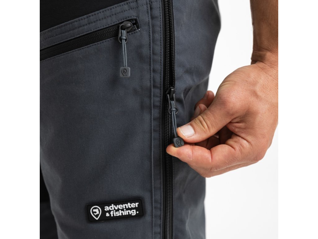 Odvetrávanie v oblasti stehien zaisťuje ľahká sieťka, a nohavice je možné nastaviť pomocou suchého zipsu alebo rozopnúť až ku členkom, čo uľahčuje obúvanie vyšších topánok alebo brodenie riekou. Nohavice sú decentne obrandované logy Adventer & fishing na stehnách a gombíku.