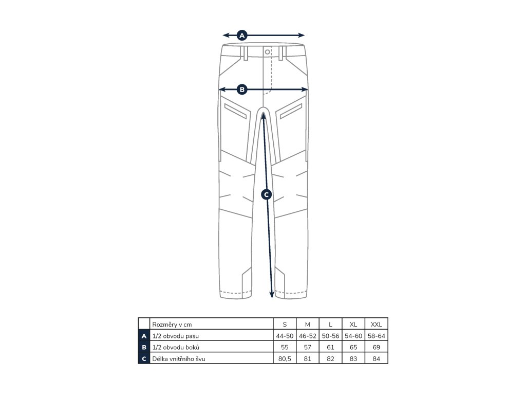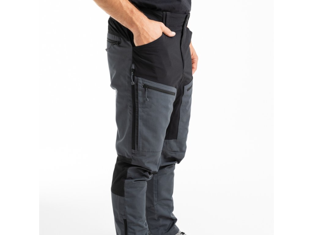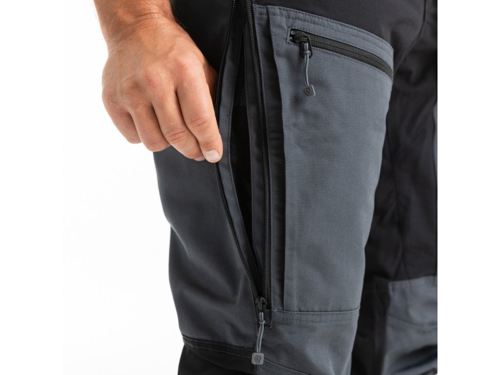 Nohavice majú moderný strih, ktorý sedí takmer každej postave. Sú vybavené ôsmimi vreckami, vrátane dvoch zadných a ďalších vreciek na stehnách, všetky s praktickými zipsami a dlhými ťahadlami, ktoré sa ľahko nahmatajú. Rázporok je zapínaný na veľký gombík a chránený krycou légou, pričom náhradný gombík je súčasťou balenia. V zadnej časti pása je pružná guma pre maximálne pohodlie pri pohybe aj v sede.