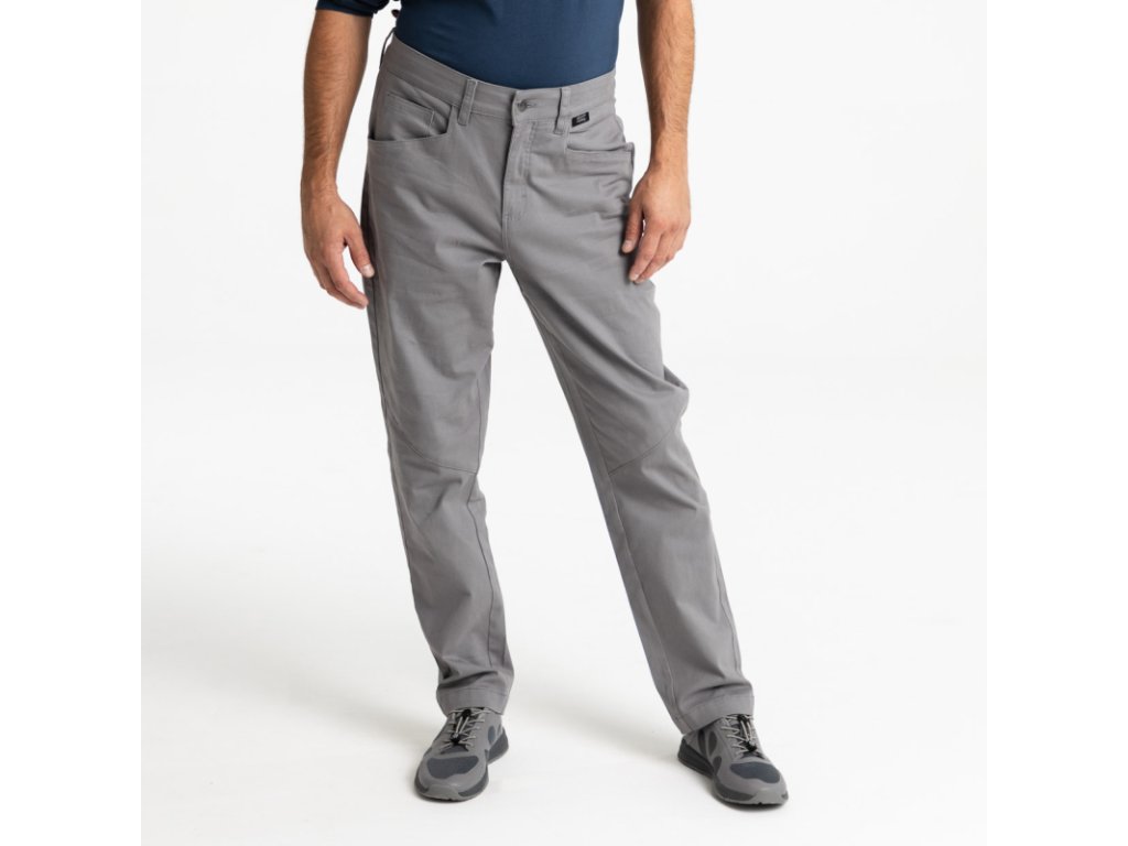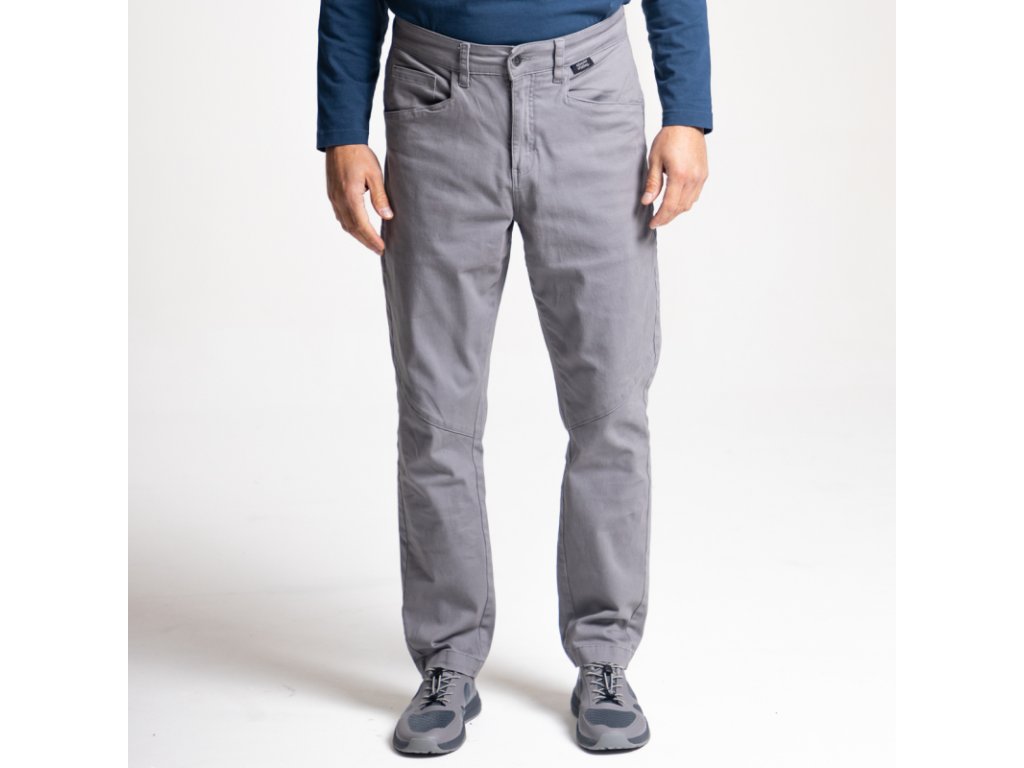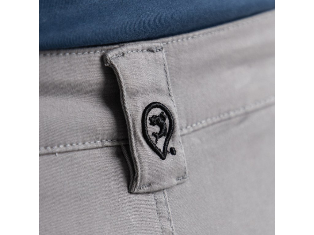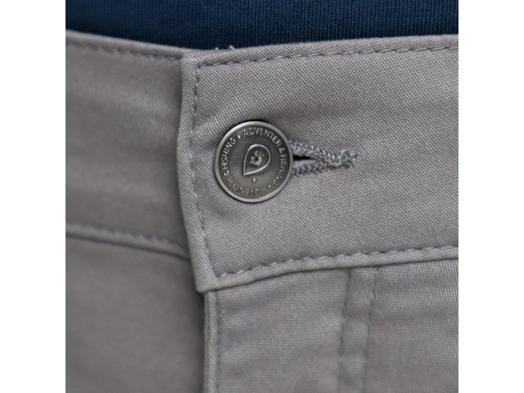 Pánske nohavice v šedej farbe Steel z pružného materiálu, ktorý zaistí voľnosť pohybu pri akejkoľvek outdoorovej aktivite. Nohavice majú štyri praktické vrecká, otvor na prevlečenie opasku a gombík zdobený nápisom s názvom spoločnosti.