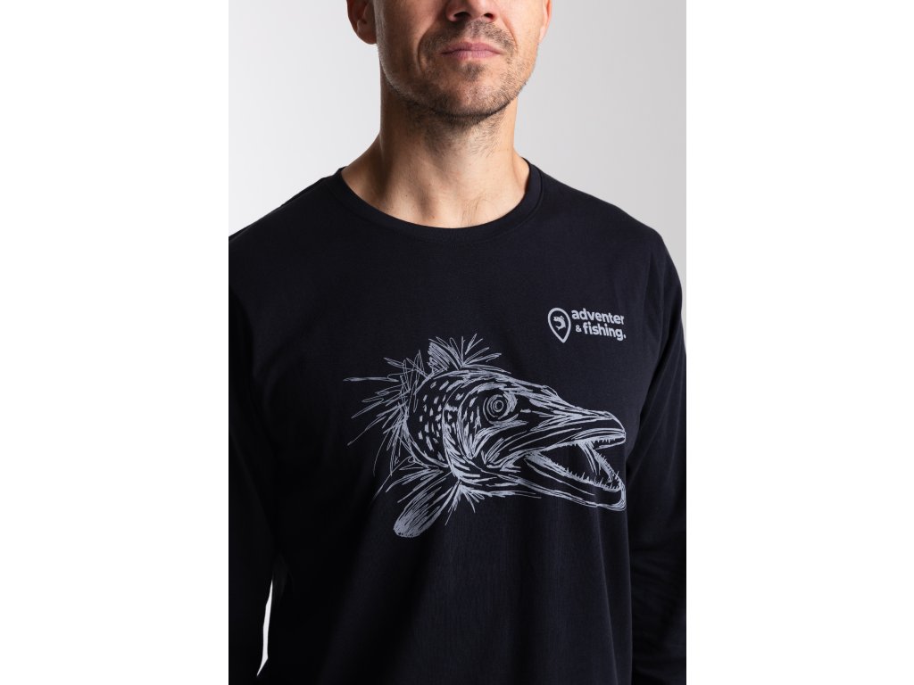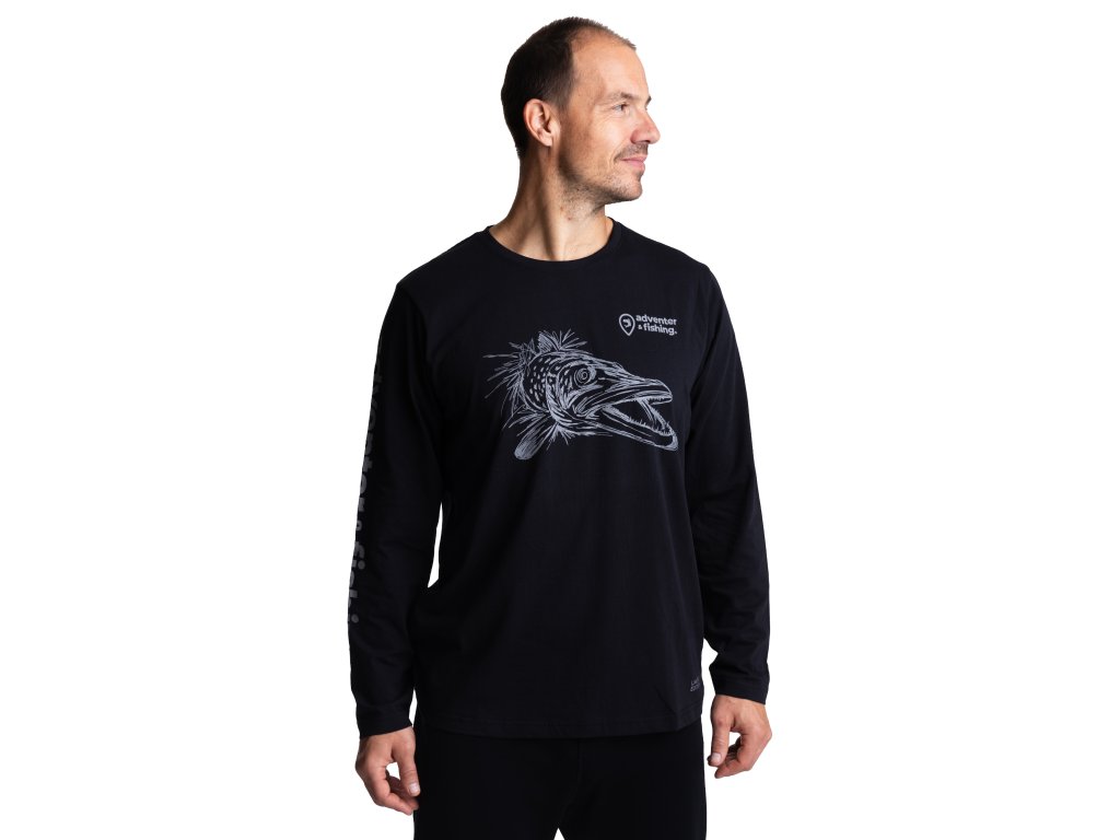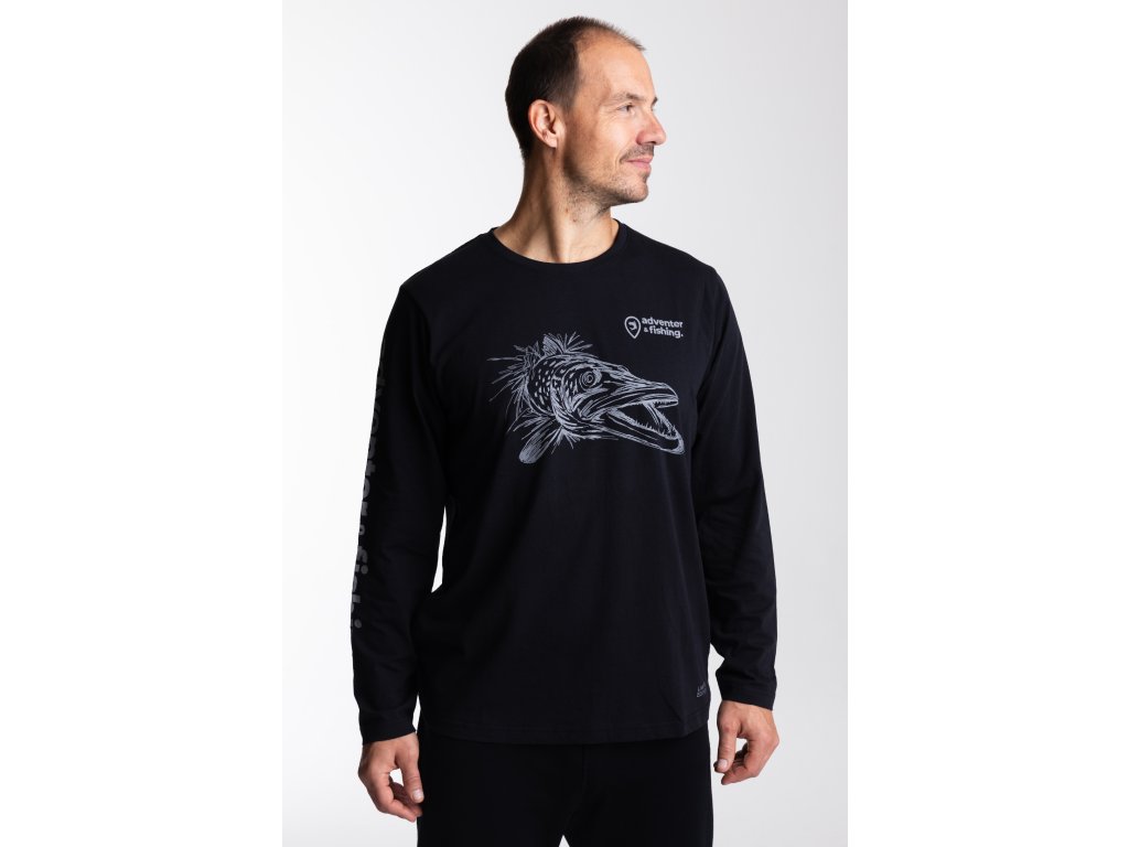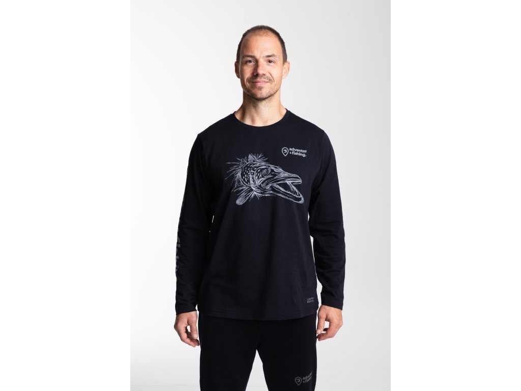 Pánske bavlnené tričko Adventer Black Pike s dlhým rukávom v čiernej farbe je vyrobené zo 100% jemnej bavlny (fine cotton), ktorá zaisťuje maximálne pohodlie po celý deň. Vďaka voľnému strihu umožňuje tričko neobmedzený pohyb, čo ho robí ideálnym ako pre šport, tak aj pre ležérne každodenné nosenie. Limitovaná edícia s potlačou šťuky je dokonalým dizajnovým prvkom pre každého nadšenca v love šťúk a dravcov celkovo.